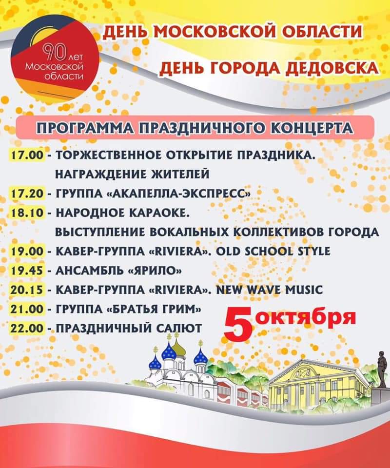 5 октября в рамках празднования 90-летия Московской области состоится и долгожданное событие для дедовчан — горожане отпразднуют День города.