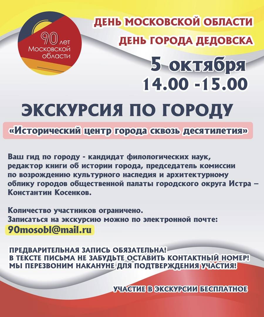 Кстати, это не все сюрпризы праздничной програмы. На день празднования 90-летия Московской области у вас есть отличный шанс узнать уникальные факты из истории города Дедовск. Горожане и гости города смогут прогуляться по родным местам и услышать интересный рассказ «Исторический центр города сквозь десятилетия».