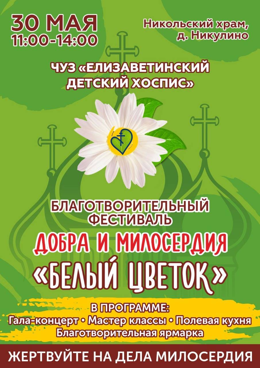 Благотворительный фестиваль «БЕЛЫЙ ЦВЕТОК» состоится 30 мая с 11:00 до 14:00 на территории Никольского храма с. Никулино.