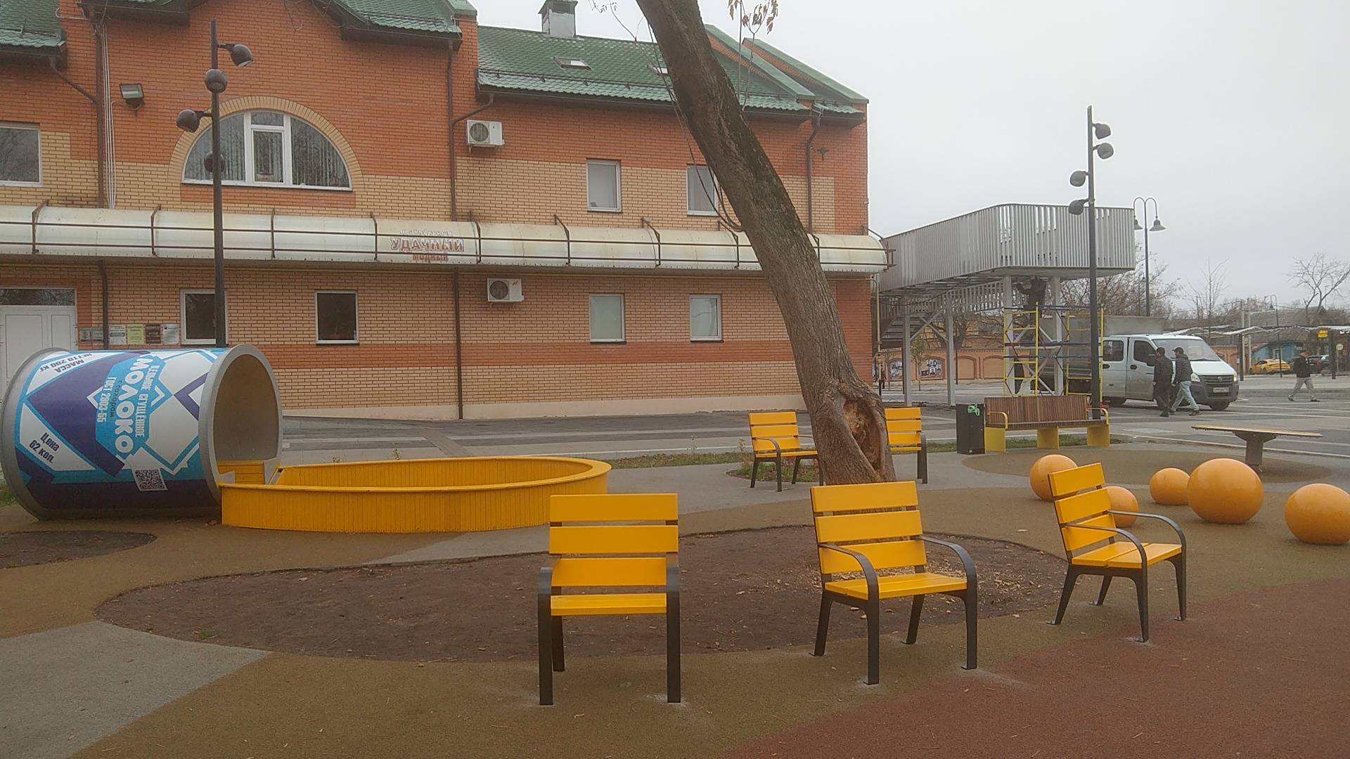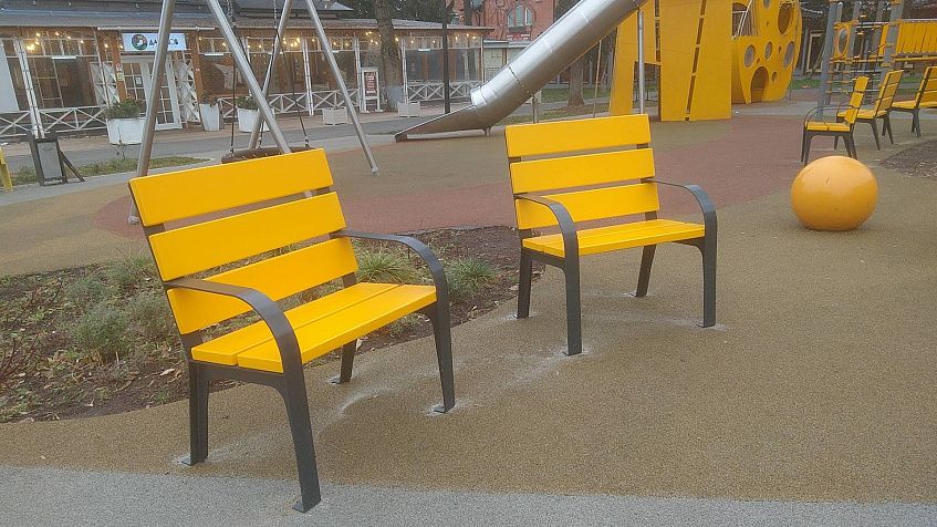 Малые архитектурные формы выполнены в стиле самой сырной площадки, в жёлтых тонах. Расположили их непосредственно на территории детского комплекса. Присесть отдохнуть и при этом не потерять своё чадо из виду теперь будут иметь возможность больше горожан. Чтобы исключить действия вандалов, лавочки закрепили у основания. В такой конструкции они и более надёжны в использовании.