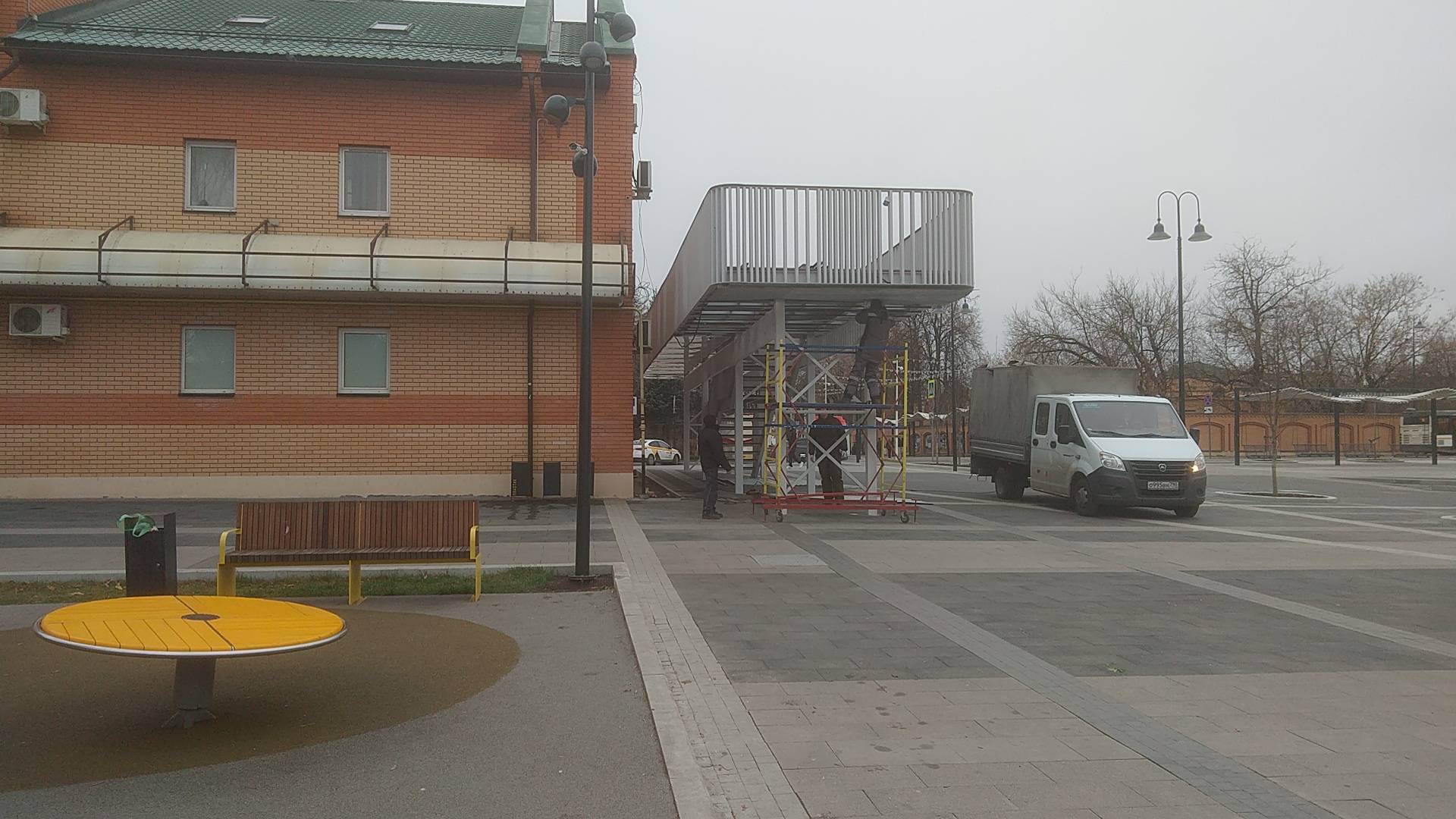 Несмотря на официально завершившееся благоустройство в центре Истры, рабочие продолжают работу по исправлению недочётов. Сегодня, например, мы заметили движение в районе будущего "поющего балкона".