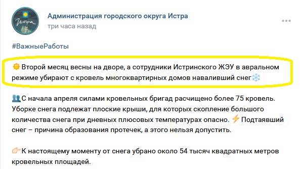 В заметке пресс-службы администрации г. о. Истра уточняется, что только за первые пять дней апреля силами кровельных бригад расчищено более 75 кровель.