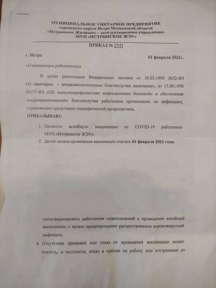 Соответствующий приказ подписан 1 февраля 2021 года очередным руководителем МУПа Игорем Филатовым, где чёрным по белому приказывают провести всеобщую вакцинацию от Covid-19 работников МУП «Истринское ЖЭУ».