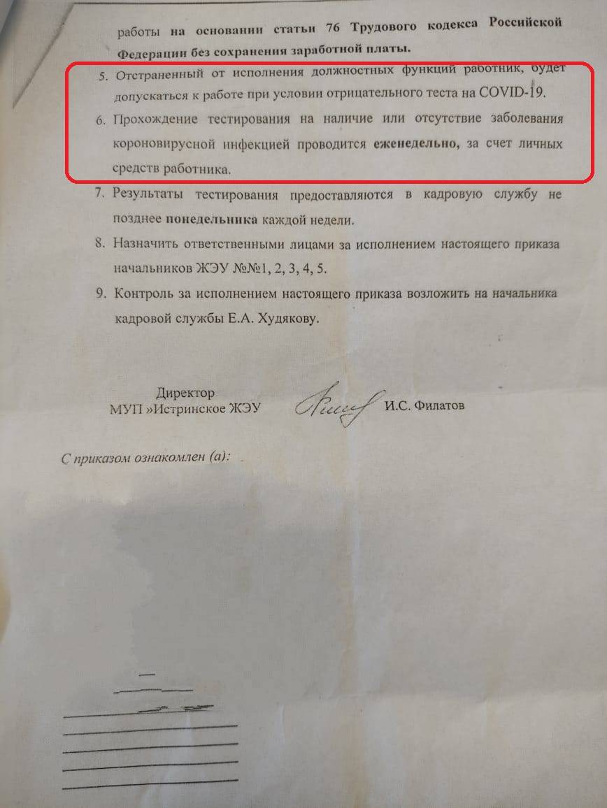 Далее по тексту следует, что отстранённый от исполнения сотрудник будет допускаться к работе при условии отрицательного теста на ковид. А предоставлять этот самый тест он будет обязан еженедельно и, что самое интересное, за счёт личных средств.