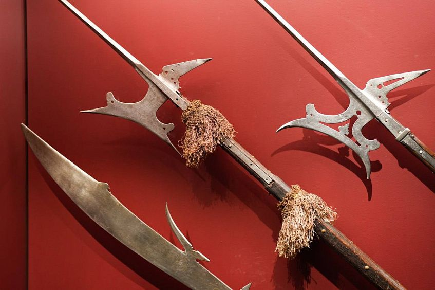 Из фондов музея «Новый Иерусалим» в экспозиции выставки представлены кольчуга XV–XVI вв. и древковое оружие XVI–XVII вв.