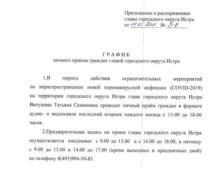 В документе делается акцент на том, что в период действия ограничительных мероприятий по нераспространению новой коронавирусной инфекции на территории городского округа его глава Истра Татьяна Витушева проводит личный приём граждан в формате аудио- и видеосвязи последний вторник каждого месяца с 15.00 до 18.00 часов.