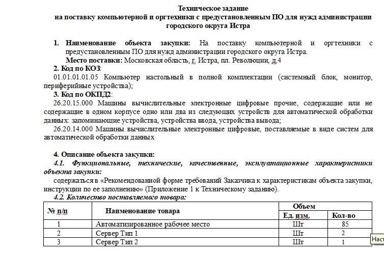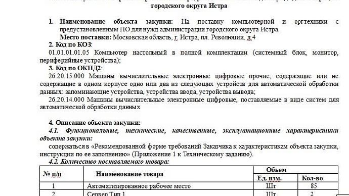 В конкурсной документации уточняется, что поставка компьютерной и оргтехники с предустановленным ПО для нужд администрации городского округа Истра должна быть осуществлена по адресу: г. Истра, пл. Революции, д. 4.