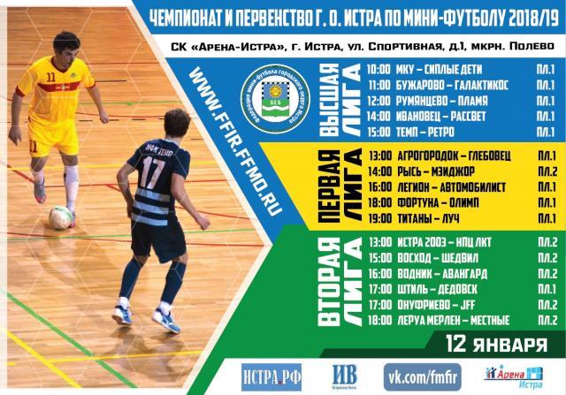 В субботу, 12 января в СК "Арена-Истра" состоятся матчи Чемпионата и Первенства городского округа Истра по мини-футболу. Приглашаются болельщиков и любителей мини-футбола прийти на трибуны и поддержать команды!