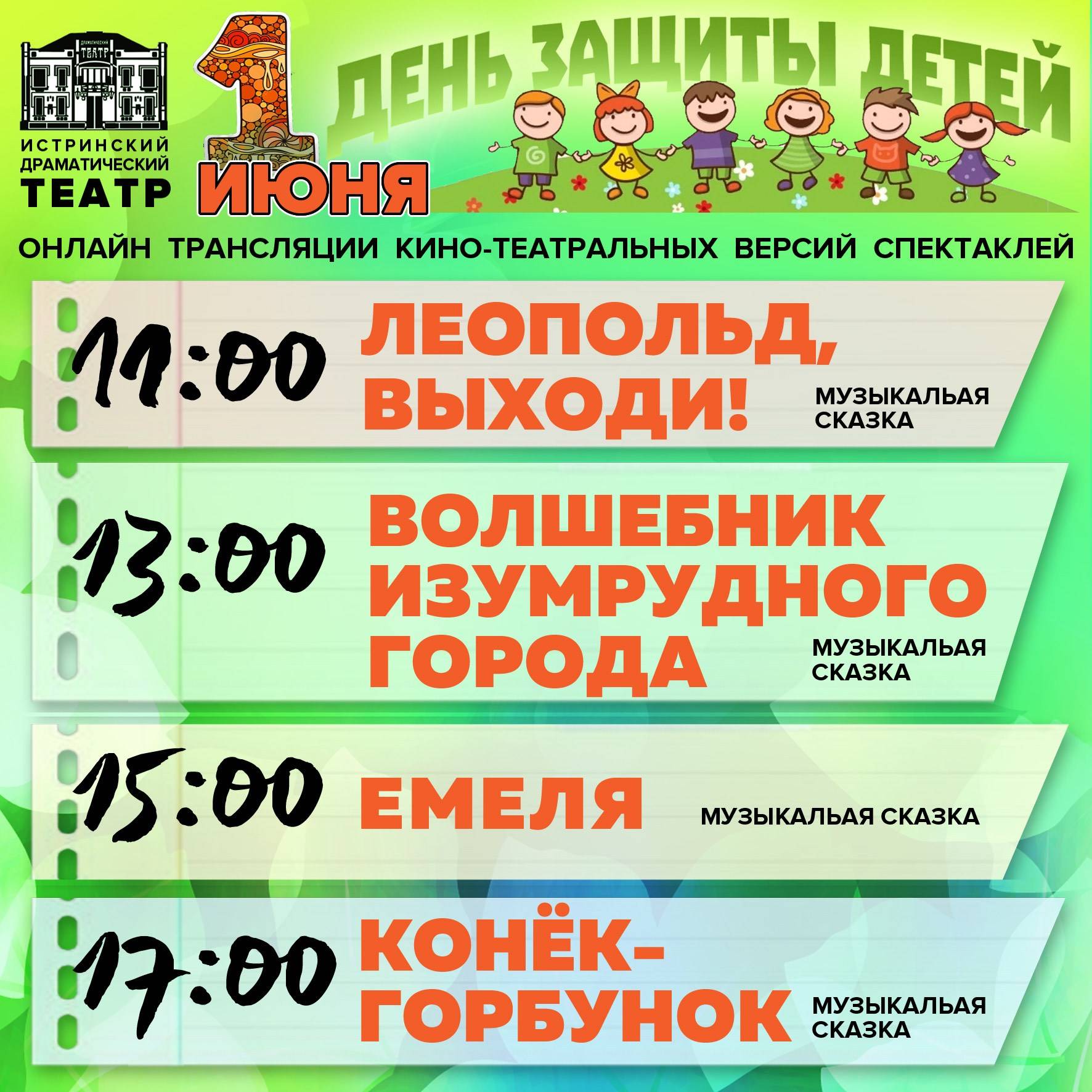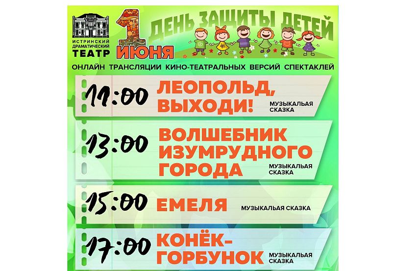 День защиты детей впервые пройдет в онлайн-формате. В первый день лета Истринский драмтеатр предлагает программу интереснейших онлайн-трансляций лучших детских спектаклей.