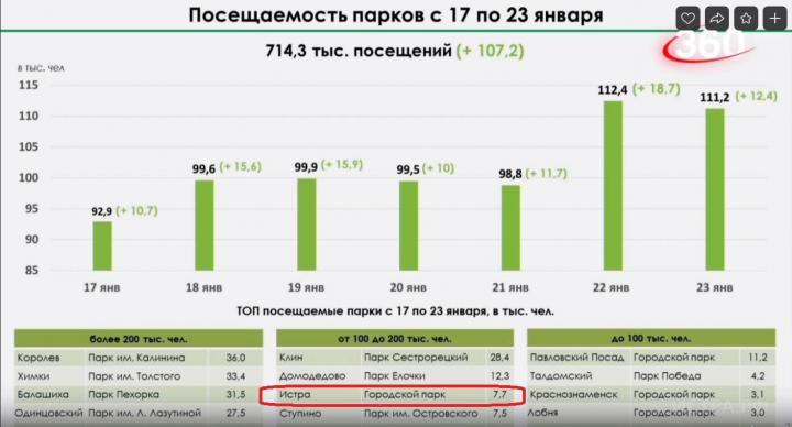 Возвращаясь к докладу Хайкина, отметим, что в целом по региону с 17 по 23 января в парках зафиксировали более 714 тыс. посещений. При этом в прошлом году за эту же неделю было более 500 тыс. посещений.