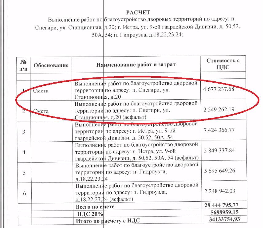Работы на данной территории уже начались. А мы отметим, что согласно документации к электронному аукциону, выполнение работ по благоустройству дворовой территории в п. Снегири, ул. Станционная, д. 20, обойдутся бюджету в круглую сумму.