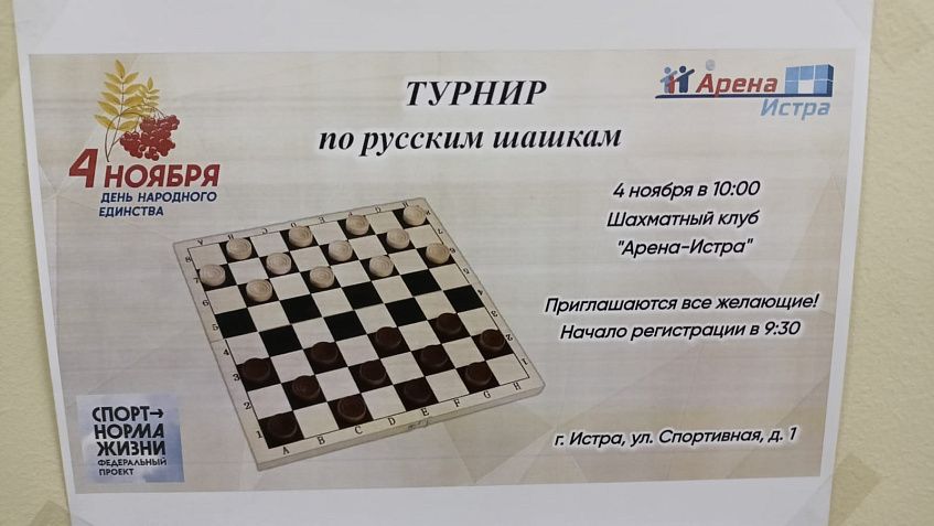 4 ноября в Истринском шахматном клубе пройдёт турнир по русским шашкам.
