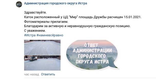 Жалоба на днях была опубликована на портале "Добродел". Заявитель пытается с её помощью разобраться в ситуации, по какой причине каток не могут залить, после чего периодически расчищать от снега: "У ЦД Мир не могут залить каток. Коробку сколотили пару месяцев назад, дети ждали на каникулах, чтобы покататься — не смогли. Всё дело в том что "специалисты" заливают его холодной водой, и он застывает буграми. Деньги вылетают просто в трубу! Коробка так и стоит в снегу, загорожена, кататься нельзя. А на дворе уже 14/01. Может, после моего обращения что-то изменится в лучшую сторону".