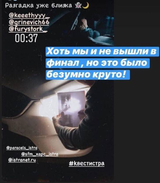 Хорошо, что искать предстояло не нам, а участникам игры. Казалось, что в зарослях кустов кто-то притаился, чтобы устроить подвох… Но вот — шелест колес по асфальту, свет фар осветил местность, в автомобиле видны улыбающиеся лица. Первой добралась до нужной точки команда «НастенькЭ». Я заглянула в авто, и стало понятно, с кем связано название группы – за рулём сидела девушка!