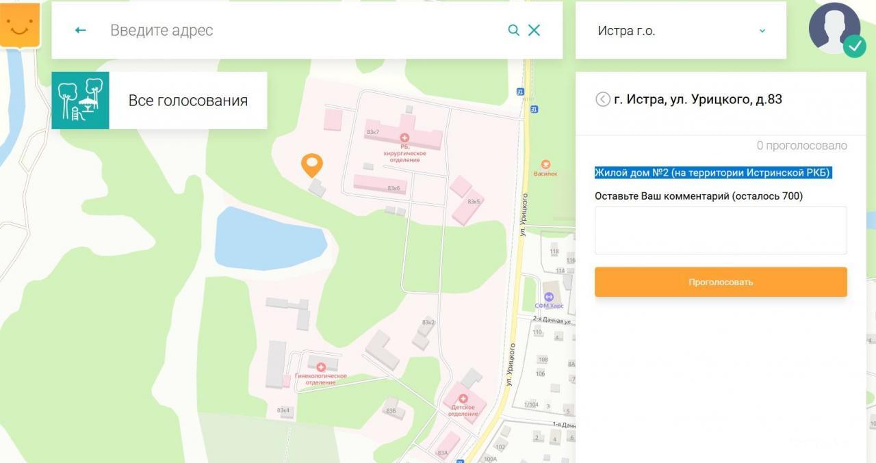 От городского округа Истра на голосование выставлено 23 объекта. В числе прочих — здание бывшей станции тубдиспансера. На протяжении нескольких лет муниципалитет и Росимущество не могли прийти к консенсусу по данной территории. Дедовчане же видят здесь в будущем зону отдыха, в том числе для пожилых людей, со скамейками и дорожками. "Так как наших пожилых жителей города лишили зоны отдыха возле ДК в связи с реконструкцией парка", — аргументируют в комментариях.