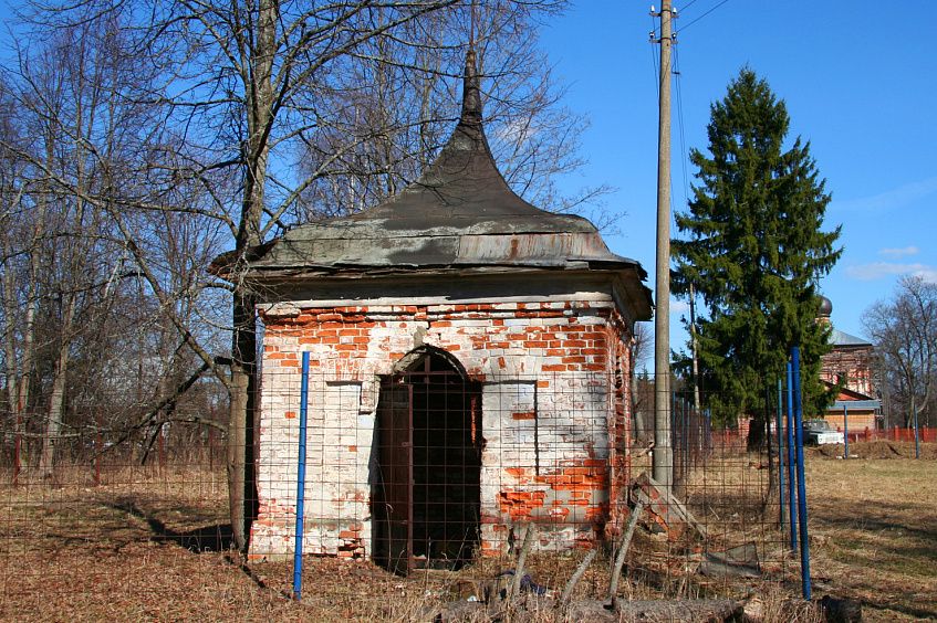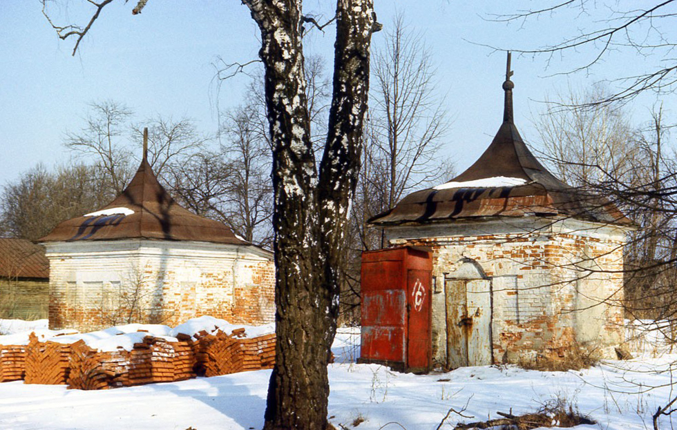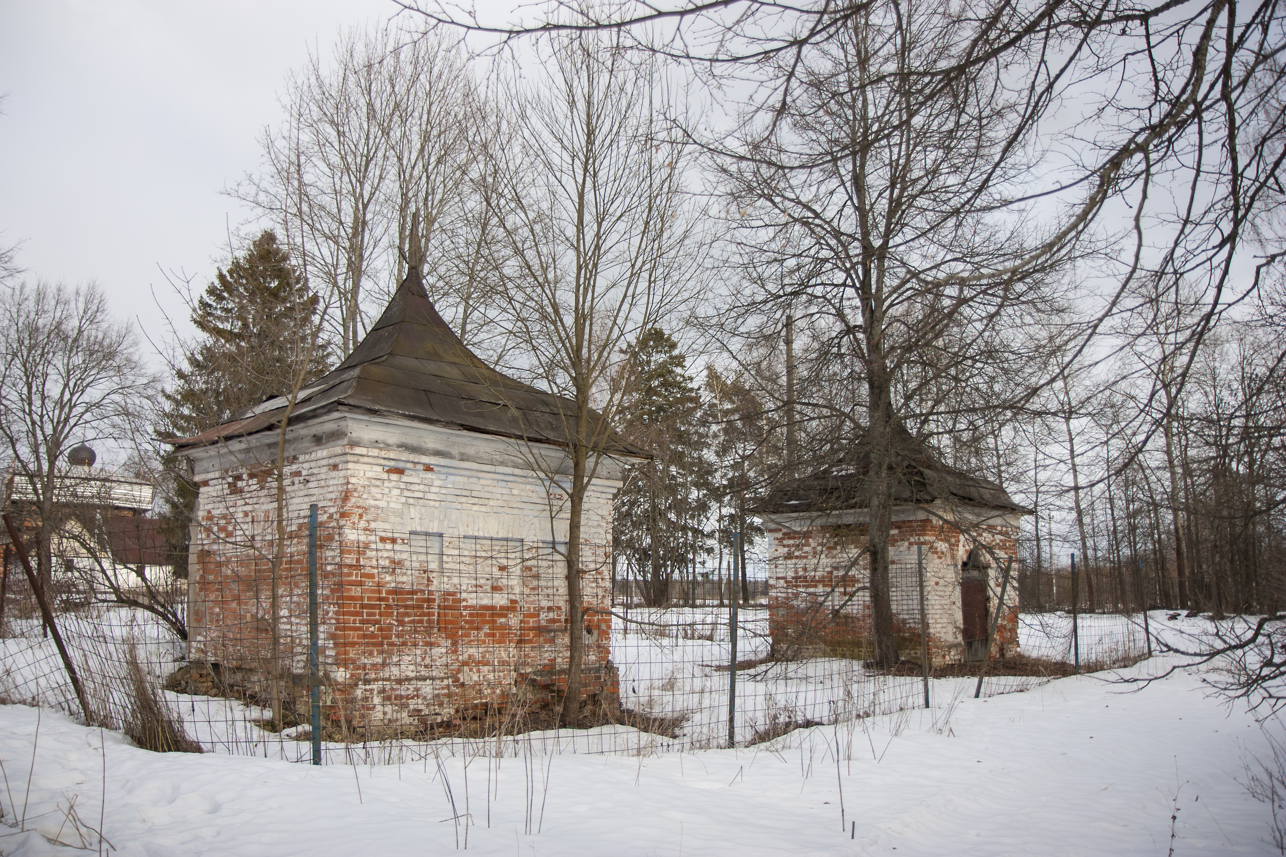Двум зданиям в составе церковного ансамбля остро требуется балансодержатель для проведения противоаварийных и реставрационных работ. Правый павильон на фотографии – часовня у въезда во двор Казанской церкви. Левый павильон – сторожка. Дорога мимо них ведёт в усадебный парк на территории учебно-оздоровительного центра “Истра”. Культовое сооружение и объект рядом не охраняются, замусорены внутри, как и территория по их периметру.