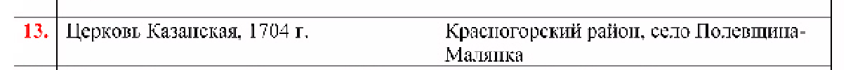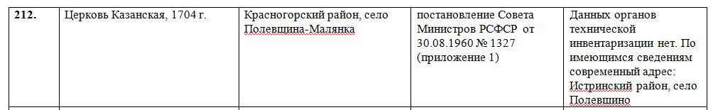 В существующей карте границ территории и зон охраны объектов культурного наследия в составе генерального плана округа транслируется одна и та же ошибка по адресации объекта культурного наследия федерального значения (постановление Совета Министров РСФСР от 30.08.1960 № 1327), который относится к “Красногорскому району, селу Полевщина-Малянки”.