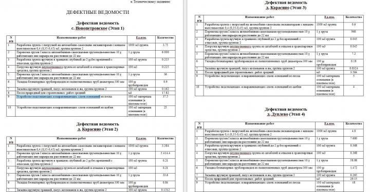 В списке три населённых пункта: с. Новопетровское, два участка д. Карасино и д. Дуплёво. В дефектной ведомости помимо прочих указаны работы по укладке безнапорных трубопроводов из полиэтиленовых труб и устройство подстилающих и выравнивающих слоёв оснований.