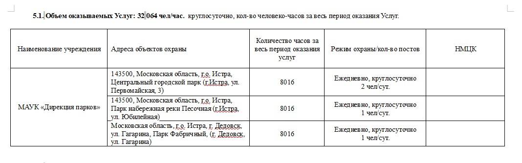 В техническом задании также указано конкретное место оказания услуг. Речь идёт о трёх объектах, два из которых расположены в райцентре. Это центральный городской парк (г.Истра, ул. Первомайская, 3) и парк на набережной реки Песочной (г. Истра, ул. Юбилейная), а также Фабричный парк (г. Дедовск, ул. Гагарина).