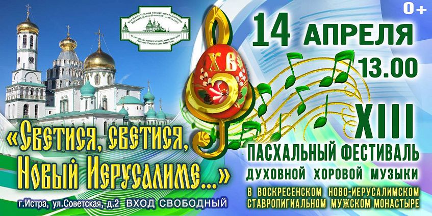 14 апреля в 13:00 в Воскресенском Ново-Иерусалимском ставропигиальном мужском монастыре состоится XIII Пасхальный фестиваль духовной хоровой музыки «Светися, светися, Новый Иерусалиме…». Мероприятие будет проводиться по благословению наместника Воскресенского Ново-Иерусалимского монастыря архимандрита Феофилакта и при поддержке Благотворительного Фонда по восстановлению Воскресенского Ново-Иерусалимского монастыря.