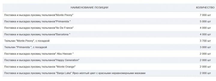 В случае удачного стечения обстоятельств истринцы уже в ближайшие месяцы смогу лицезреть на улицах города махровые пионовидные жёлтые тюльпаны "Monte Peony", которые, как правило цветут в в апреле-мае, а также высокие и эффектные цветы с бокалом красно-вишнёвого цвета "Ile De France", красно-лиловые цветы "Abu Hassan", оранжевые раннецветущие тюльпаны "Monte Orange" и др. Всего в техническом задании девять позиций.