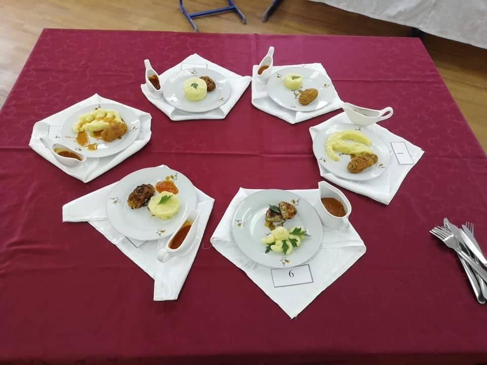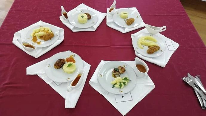 Участники соревнований в количестве 6 человек готовили блюдо "Зразы рубленые с гарниром и соусом".
