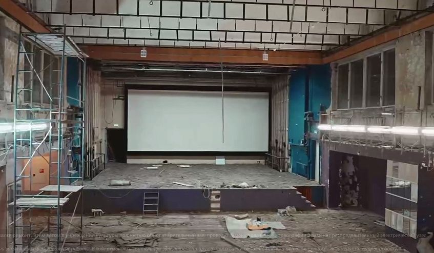 Подрядчик на сегодняшний день заканчивает демонтажные работы. В ходе ремонта в зрительном зале отремонтируют пол и сцену, обновят стены и потолок, полностью заменят электропроводку.