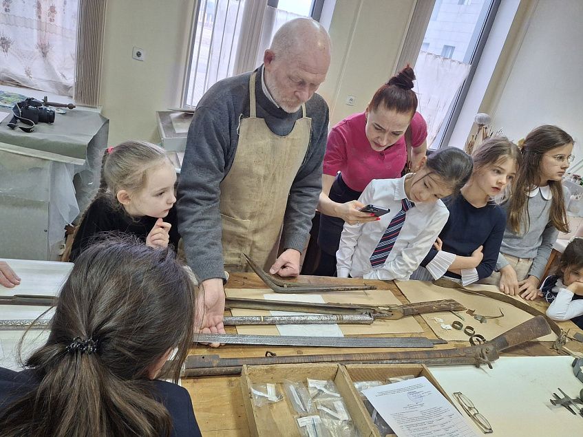 Художник-реставратор по металлу Владимир Алексеевич Ширяков раскрыл самый интересный аспект реставраторской работы – исследовательский. «Реставратор — исследователь. Каждый предмет хранит много тайн, а реставратор в процессе сохранения экспоната тщательно изучает его историю и секреты», — поделился он с ребятами.