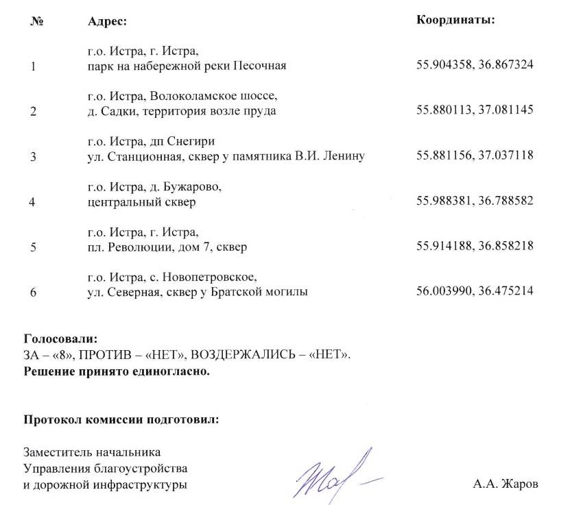 Таким образом, общественная комиссия по контролю за ходом и выполнением работ по комплексному благоустройству дворовых территорий и общественных пространств определилась. В протоколе за подписью одновременно двух замов главы при единогласном решении всех присутствующих значатся следующие адреса: