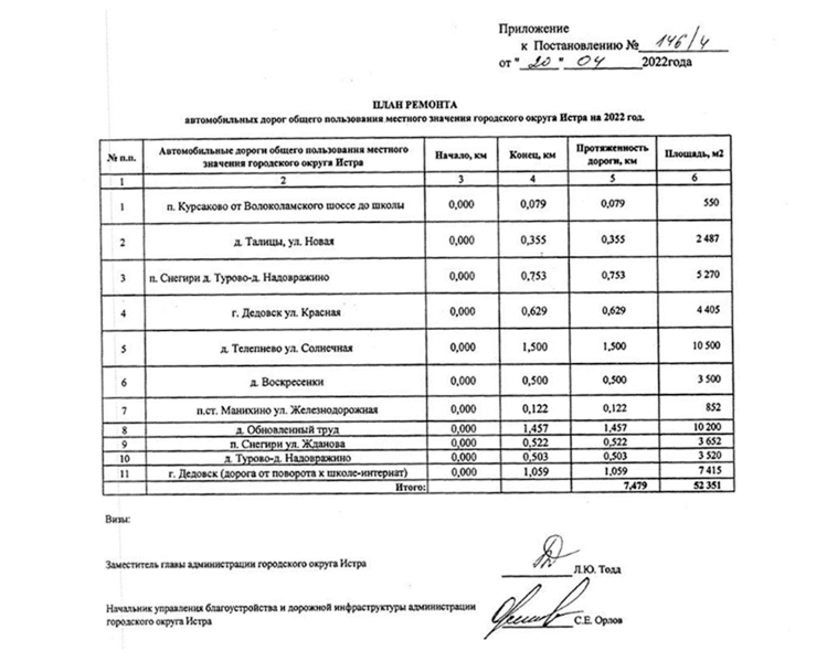 В самом плане 11 адресов. Общая протяжённость дорог — около 7,5 километров, площадь ремонта составит порядка 52 тысяч квадратных метров. В списке указана дорога от Волоколамского шоссе до школы в п. Курсаково, ул. Новая в д. Талицы, а также несколько дорог в п. Снегири, г. Дедовске, д. Телепнево, д. Воскресёнки и т.д.