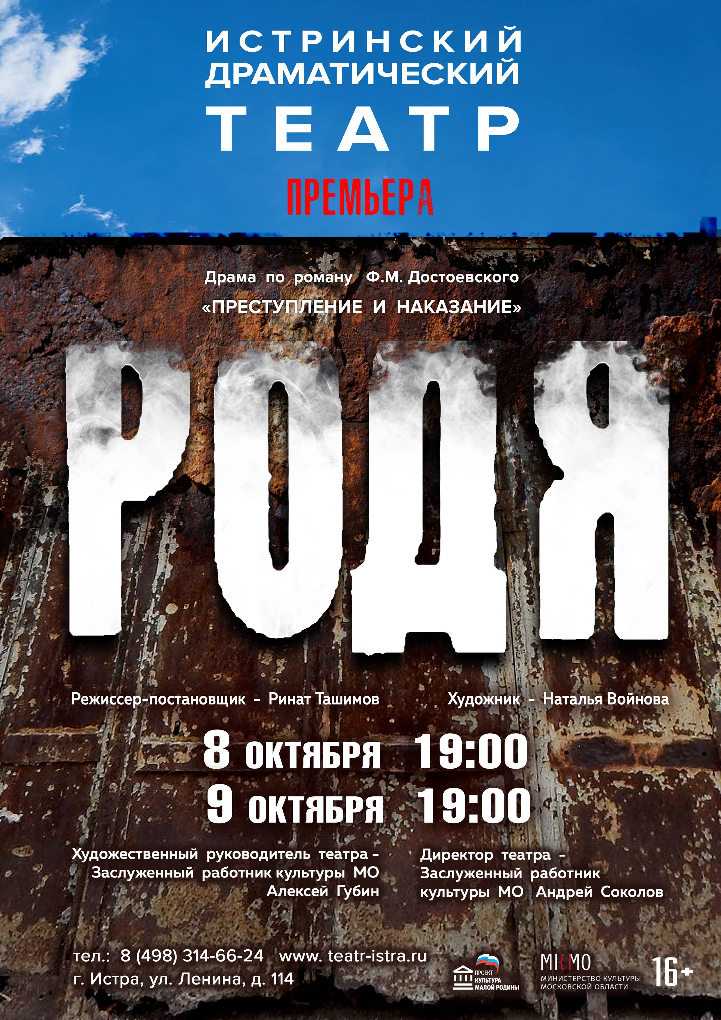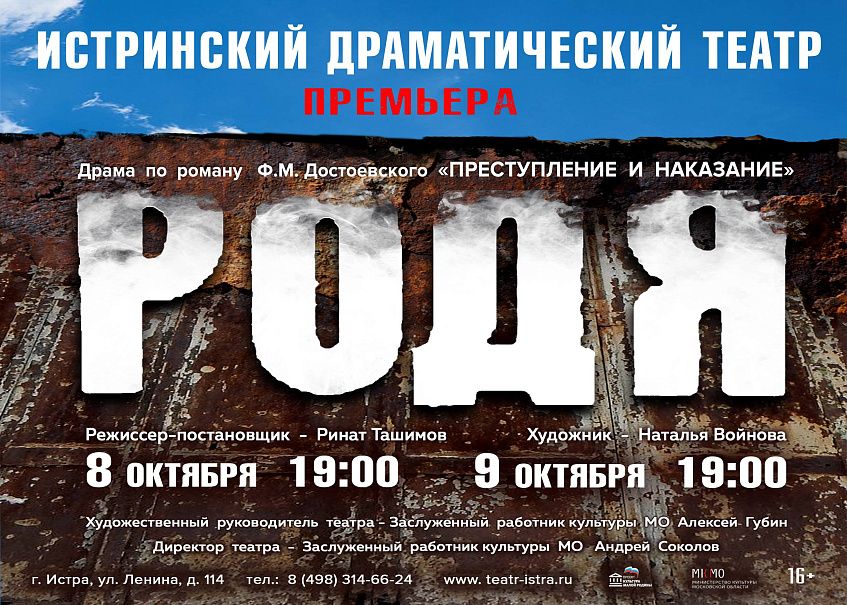 Истринский драматический театр 8 и 9 октября представляет премьеру спектакля «Родя» по роману Ф. М. Достоевского «Преступление и наказание».