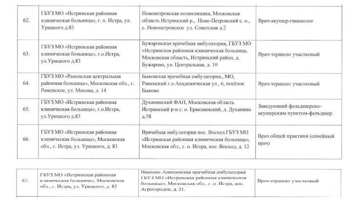 Фигурирует в списке и городской округ Истра.Так, в частности, в Новопетровскую поликлинику требуется врач-акушер-гинеколог, в Бужаровскую — участковый врач-терапевт. Он же требуется и в амбулаторию п.Агрогородок. В ФАП Духанино — заведующий фельдшерско-акушерским пунктом-фельдшер. В посёлке Восход, врачебная амбулатория которого относится также к Истринской РКБ, для работы необходим врач общей практики (семейный врач).
