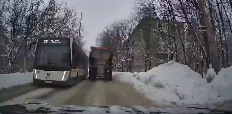 В Телеграм-чате «Истра онлайн» водители попросили Мосавтодор и Мостранс прокомментировать ситуацию с заужением дорог в городе из-за некачественной расчистки снега, прикрепив видео с автобусом и грузовиком.