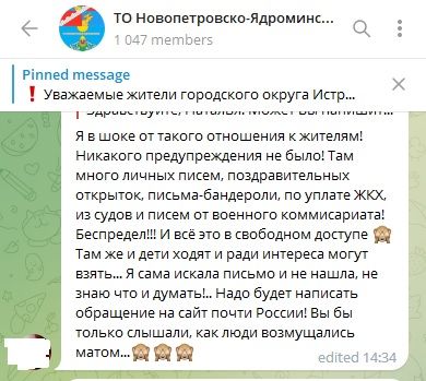 Больше всего, что меня возмутило, что я наткнулась на большую пачку писем от военных! Родные ждут эти письма, но они не дождутся их. Две коробки: квитанции, налоги, поздравительные открытки — всё валяется в одной куче», — сообщила девушка своим односельчанам в поселковом чате.