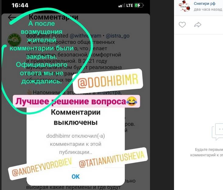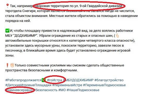 И вот на днях пресс-служба администрации г. о. Истра отчиталась в одном из постов о том, что в 2021 году муниципалитетом реализована обширная программа по преображению общественных территорий. Каково же было удивление жителей Снегирей, когда в заметке они увидели до боли знакомый адрес...