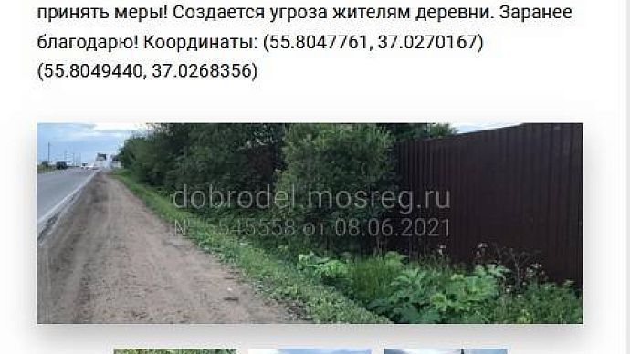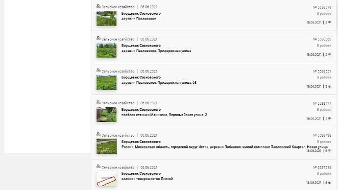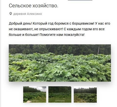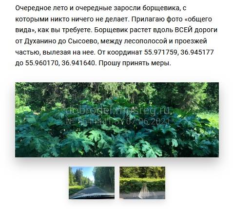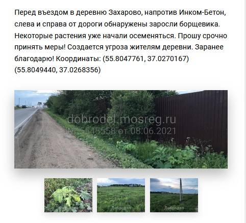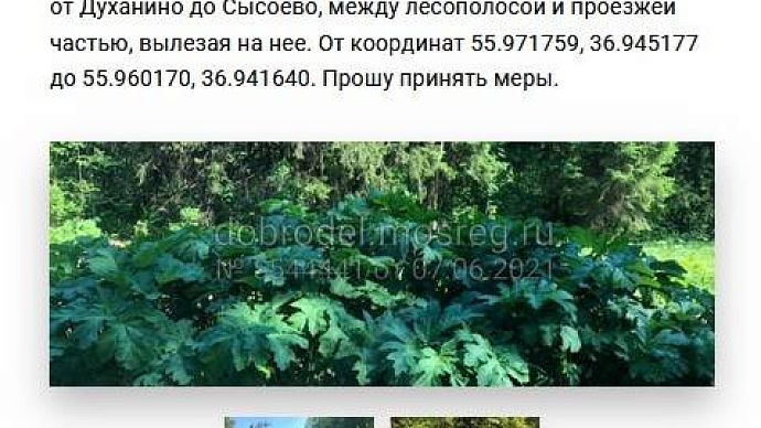 На портале "Добродел" жители округа ежедневно обращаются за помощью в борьбе с опасным растением. Так, в одном из последних обращений идёт речь о пешеходной дорожке у платформы Лесодолгоруково. Местные пишут, что огромная территория заросла борщевиком: "И дорожка, по которой люди идут с электрички к деревне Шапково, тоже плотно заросла. Люди буквально продираются сквозь листья борщевика".