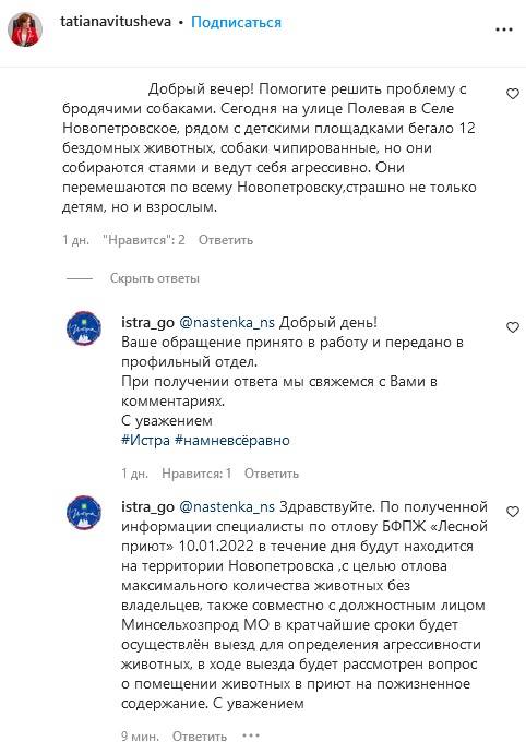Позже в чате "ТО Новопетровское" местным пояснили, что теротдел осуществляет свою деятельность в соответствии с действующими нормативно-правовыми актами: "Обращение с бесхозяйными животными проводится согласно постановлению правительства Московской области “Об утверждении порядка осуществления деятельности по обращению с животными без владельца". Согласно п.35 указанного Порядка, возвращению в прежние места обитания подлежат неагрессивные животные без владельцев после проведения в отношении них мероприятий по карантинированию, мечению (чипированию), вакцинации и стерилизации в соответствии с Порядком организации деятельности приютов для животных и нормами содержания животных в них, утверждённых постановлением Правительства Московской области".