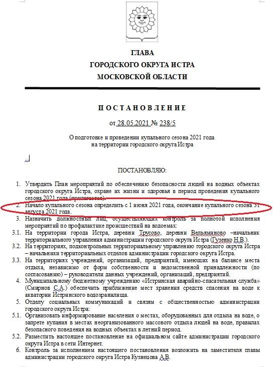 При этом профильному заму администрации поручено организовать контроль за экологической обстановкой в местах отдыха граждан у воды, проводить с отдыхающими профилактическую работу, результаты работы освещать в местных средствах массовой информации. Отделу МВД поручили усилить контроль за поддержанием общественного порядка в местах массового граждан у воды, а сотрудникам «Мособллеса» (Степанов А.А.), совместно с Отделом надзорной деятельности по городскому округу Истра, — в пожароопасный период усилить контроль и принять необходимые меры по вопросам пожарной безопасности в местах массового отдыха, примыкающих к лесным массивам, и в самих лесных массивах.