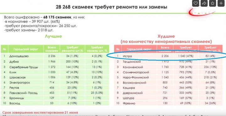 Истра возглавила рейтинг худших муниципалитетов по числу ненормативных скамеек. После проведенной инвентаризации выяснилось, что почти половина всех существующих в округе лавочек подлежат ремонту.