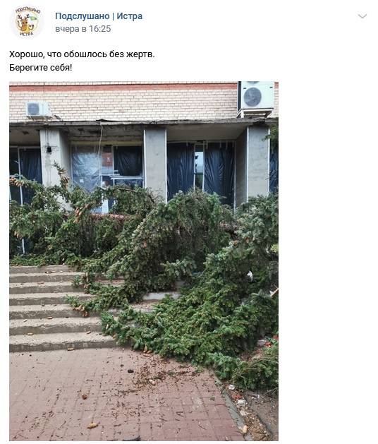 К диалогу, дабы снять напряжение, подключились и официальные лица. По информации пресс-службы администрации г. о. Истра, дерево всё же упало в связи с неблагоприятными погодными условиями.