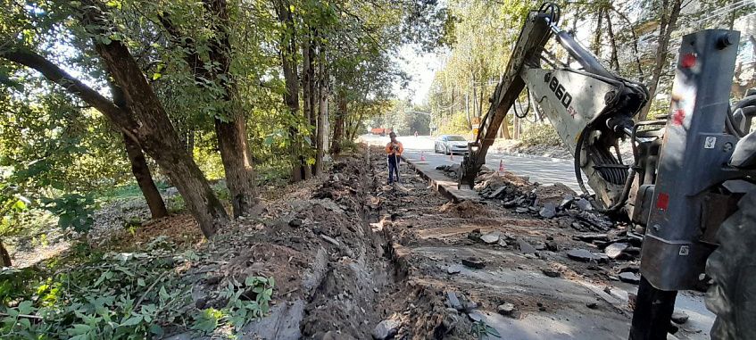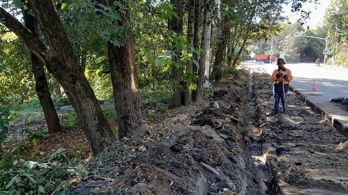 Рабочие в настоящее время выдирают с корнем бордюры и демонтируют старые тротуары. Тяжёлая техника работает вплотную к зелёным насаждениям, корневая система которых безвозвратно уничтожается.