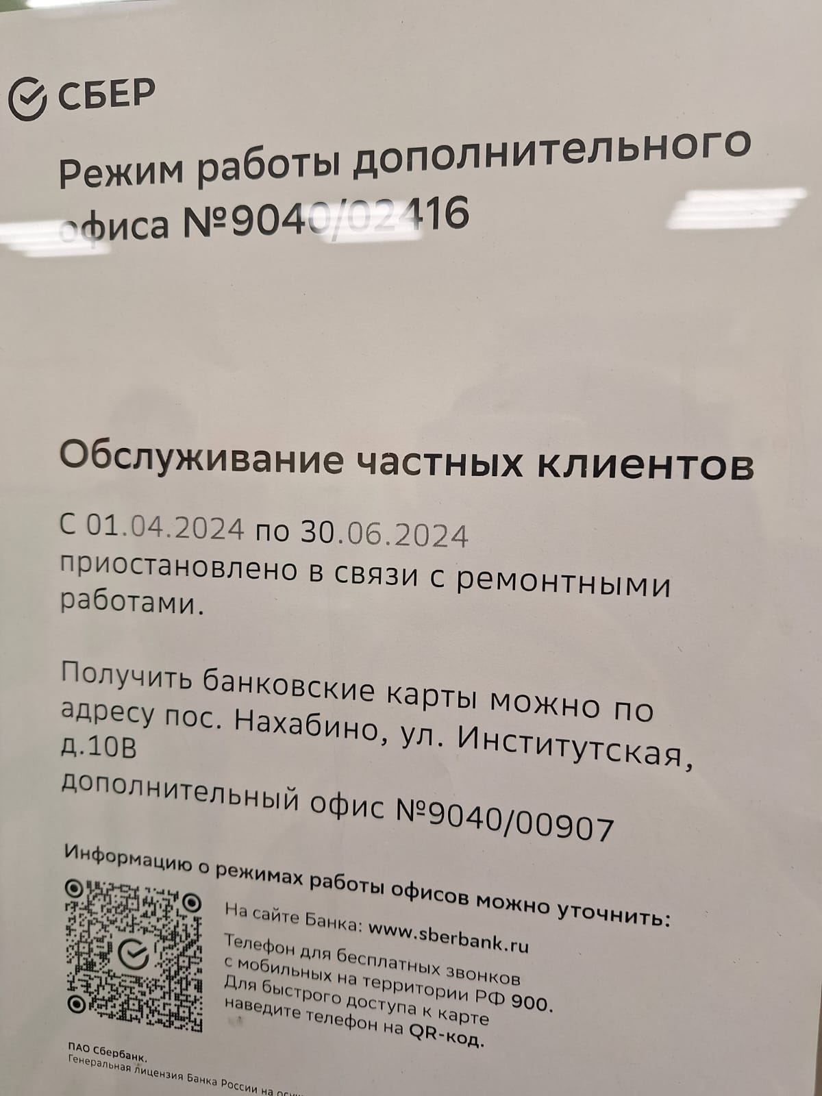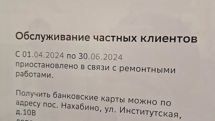 Символично, что отделение приостановит работу 1 апреля, в День смеха. Но вряд ли это чья-то первоапрельская шутка. В объявлении также указано, что получить новые банковские карты (читай — обслуживание) можно в ближайшем отделении, которое находится... в Нахабино.