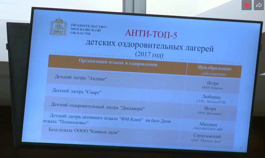 По словам руководителя администрации г.о. Истра Андрея Дунаева, что касается самого отдыха детей, в целом он подготовлен на хорошем уровне в обеих организациях. "В обоих компаниях паспорта безопасности были старой формы, в 2017 году это допускалось, но не приветствовалось. В 2018 году ни один паспорт старой формы больше не принимается", - добавил он. Именно этот фактор, по словам Дунаева, послужил попаданию в анти-топ, но руководитель округа обещал лично проконтролировать ситуацию с выездом на место.