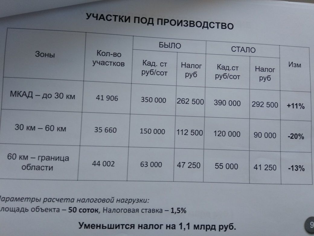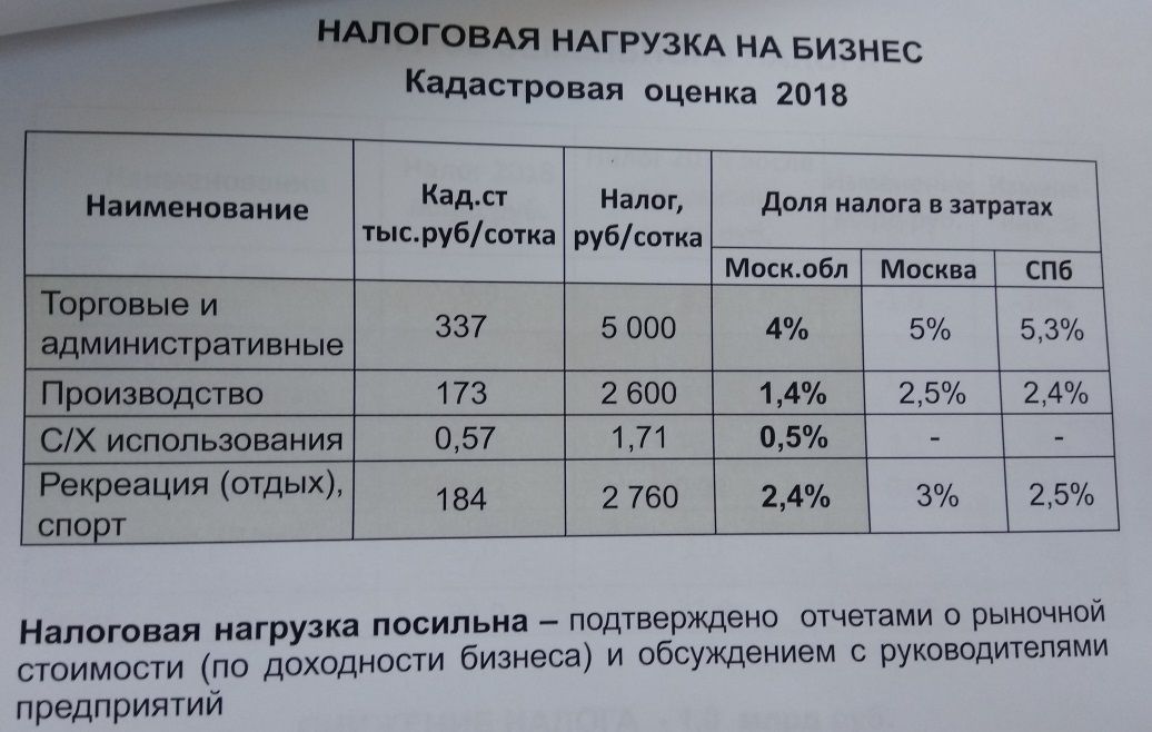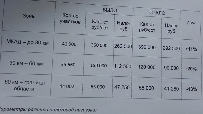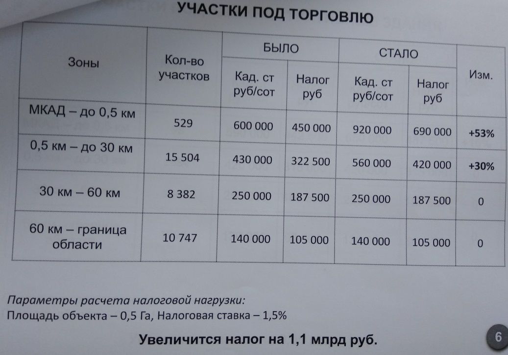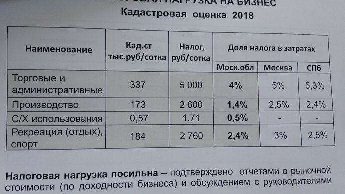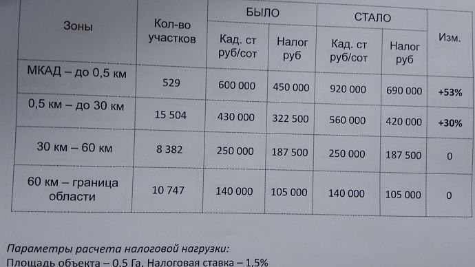 Налоговая нагрузка возрастёт по элитной земле и торговым центрам. Однако, по оценке докладчика, для бизнеса она вполне посильна. "Изучая статистику и рыночные цены, мы выяснили, что близлежащие к МКАД участки были недооценены в предыдущем раунде кадастровой оценки, которая была проведена пять лет назад. В среднем цена за сотку здесь составляла 600 тыс. рублей. Мы сделали вывод о необходимости её увеличения, и сегодня она в среднем будет составлять около 900 тыс. рублей. Такой же рост ожидает и торговые центры, которые расположены на второй линии от МКАД — там рост будет порядка 30%. Однако налоговая нагрузка не увеличится у ТЦ в городах, расположенных в отдалении от столицы", — пояснил министр.