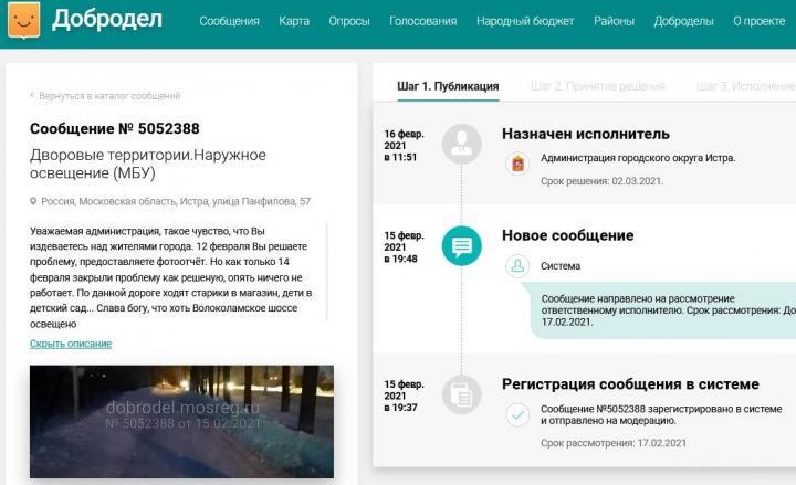 Там же, но уже 12 февраля, первый заместитель главы городского округа Истра Владимир Шевяков отвечает: "Рассмотрев обращение по вопросу наружного освещения по адресу: Россия, Московская область, Истра, улица Панфилова, 57, сообщаем: 12.02.2021 г. проведён осмотр, факты подтвердились. Работы по восстановлению наружного освещения проведены".