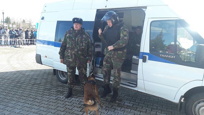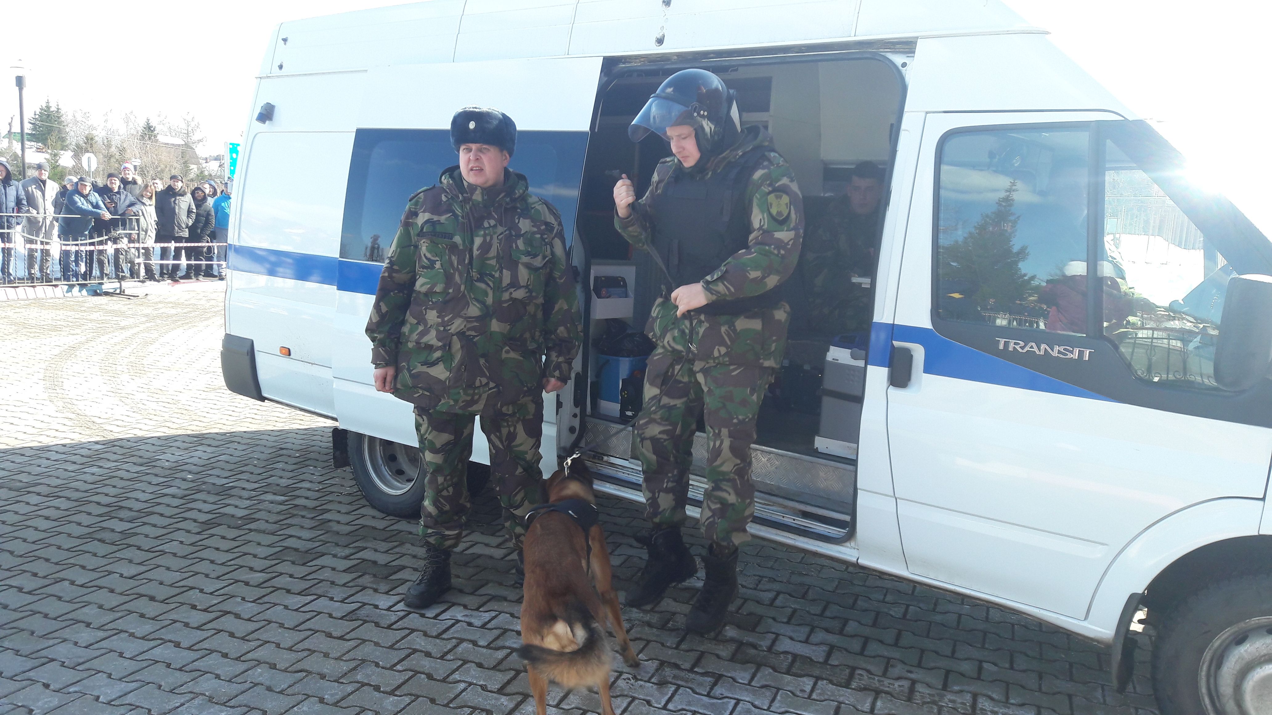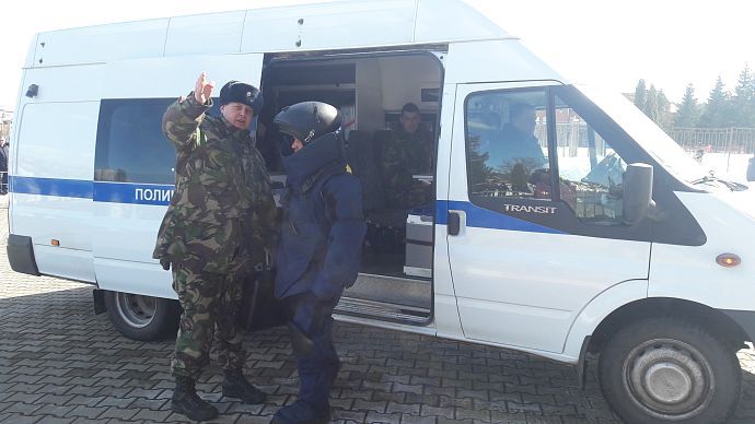 Далее все присутствующие стали свидетелями практических учений. На территории школы якобы было обнаружено взрывчатое вещество, которое было оперативно обезвреженно, после чего пожарные расчёты продемонстрировали "мастер-класс" по спасению человека из задымленного помещения.