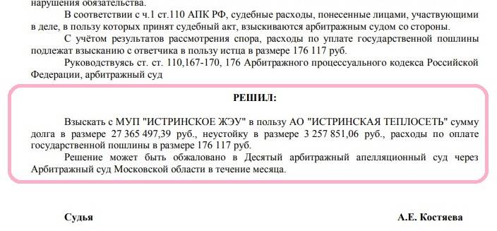 В добровольном порядке задолженность погашен не была, претензия ЖЭУ также была оставлена без удовлетворения. "Истринская теплосеть" обратилась с исковым заявлением в суд. Суд, в свою очередь, признал исковые требования обоснованными и подлежащими удовлетворению.