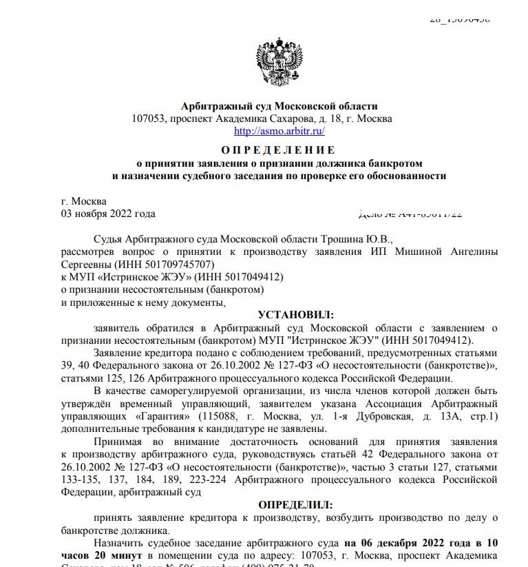 Принимая во внимание достаточность оснований суд определил возбудить производство по делу о банкротстве. Судебное заседание назначено уже на 6 декабря текущего года. За это время должник должен успеть заблаговременно уведомить учредителей о судебном заседании и представить бухгалтерский баланс.