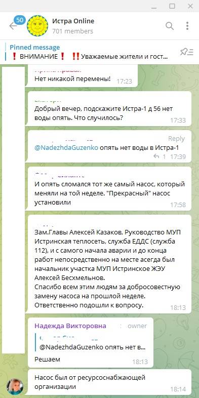 Диалог и на этот раз поддержала начальник Территориального управления администрации городского округа Истра Надежда Гузенко, пообещав оставшимся без воды её подвоз к 8 утра в среду. "Авария на ВЗУ, работы ведутся", — лаконично ответила чиновница. Насос, предоставленный ресурсоснабжающей организацией, видимо, вновь дал сбой.