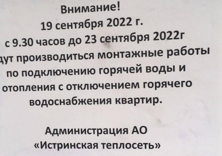 15 сентября администрация городского округа Истра заверила жителей дома № 20 по улице Ленина в Снегирях, что их дом готов к переключению с модульной котельной на общую. 16 сентября квартиры в доме залило, случилась авария.
